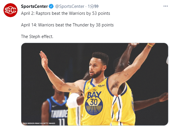 美媒SportsCenter发推写道4月3日,没有库里的勇士惨败猛龙53分;4月15日,库里带领勇士38分大胜雷霆,这就是库里效应。