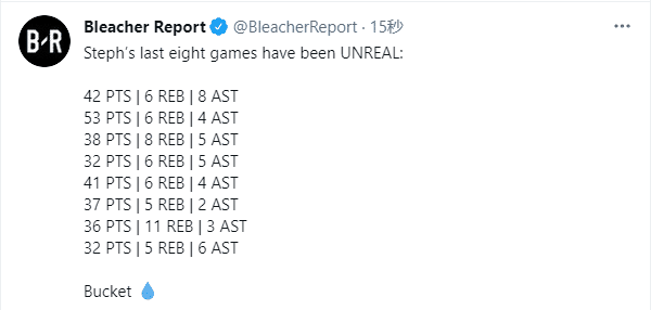 库里连续8场30+太疯狂,尤其是最近两场比赛——上一场投进10记三分狂砍53分,今天投进11记三分狂砍42分;另外六场比赛,库里数据依次是32分6助攻5篮板、36分11篮板3助攻、37分5篮板2助攻、41分6篮板4助攻、32分6篮板5助攻以及38分8篮板5助攻。