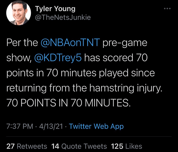 杜兰特是在和鹈鹕的比赛中复出的,当时他替补出战20分钟,100%命中率,砍下了17分;次战湖人,篮网大比分输球,杜兰特重返首发,他出场23分钟,拿下22分;再加上今天和森林狼的27分钟砍下31分,杜兰特的数据正好来到70分钟得到70分。