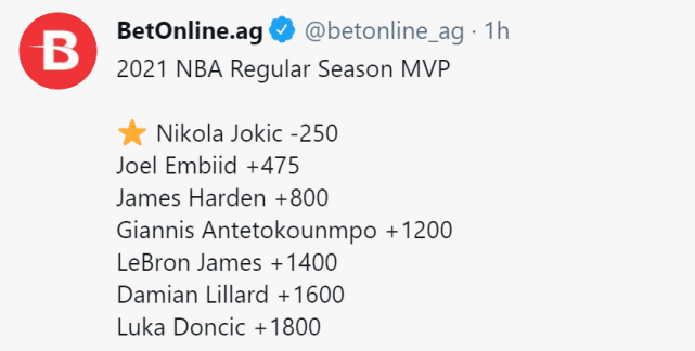 来源:JRS直播网04-13 11:38JRS直播网4月13日讯 北京时间4月13日,2021年常规赛MVP的最新赔率出炉,约基奇(-250)继续领跑,而且扩大了领先优势。恩比德(+475)排名第二,哈登(+800)位居第三。排名第4-7位的依次是字母哥(+1200)、詹姆斯(+1400)、利拉德(+1600)和东契奇(+1800)。