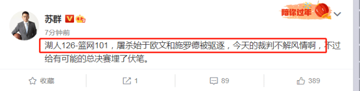 而苏群老师则说出了这场比赛的转折点,始于欧文和施罗德被驱逐。而且,苏群直言裁判不解风情,但这给可能的总决赛预演埋下伏笔。从结果来看的话,欧文被驱逐对篮网影响更大,篮网缺少一名进攻核心,而篮网恰恰也是依靠进攻赢球的队伍。