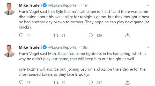 湖人再受打击!库兹马小加因伤缺战篮网,纳什:杜兰特将增加上场时间