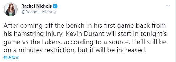 来源:JRS直播网04-11 16:01JRS直播网讯篮网再次变阵,据名记Rachel Nichols报道,杜兰特将在篮网对阵湖人比赛中首发出战,依旧会受到限时令,但上场时间比之前有所增加;此前杜兰特伤愈复出首战,被临时撤下首发并且替补上场;如今迎战卫冕冠军,杜兰特重返首发。