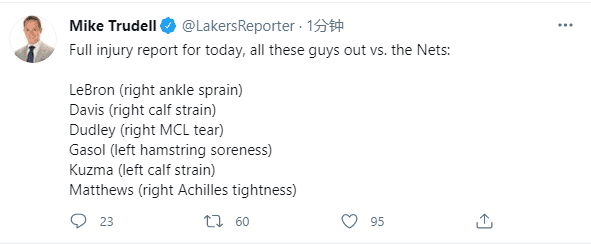 来源:JRS直播网04-11 15:57JRS直播网讯湖人对阵篮网之前,湖人队伤病大名单再次更新,全队多达6名球员因伤无法出战,据湖人随队记者Mike Trudell报道,詹姆斯(脚踝扭伤)、浓眉(小腿拉伤)、库兹马(小腿拉伤)、小加索尔(左腿筋酸痛)、马修斯(右跟腱紧张)和杜德利(韧带伤病)全都伤停,卫冕冠军太惨了。