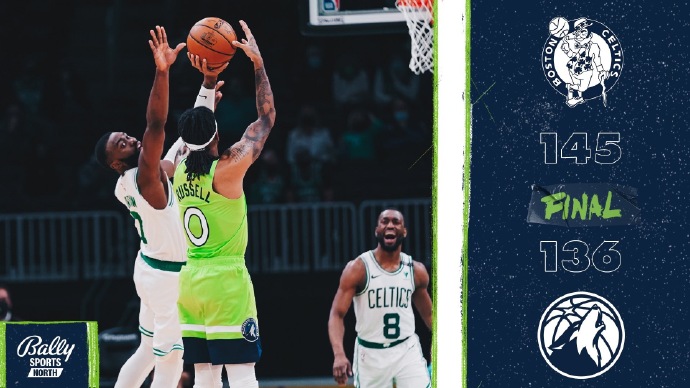 加时赛中,双方交替飚分,凯尔特人接连命中外线远投取得领先,打出14-5取得8分领先进入最后一分钟,最终以145-136战胜森林狼。