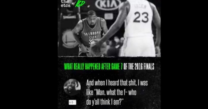 杜兰特则爆粗口回应雷霆球迷“(雷霆球迷)他们以为我和追梦一起玩耍。觉得我们两在分区决赛的时候一起潇洒。当我听到这样的屁话时,我心想,‘WTF,你们把我当成什么人了?’谁会觉得追梦在西决期间来我家玩?得了吧,别扯犊子了。”
