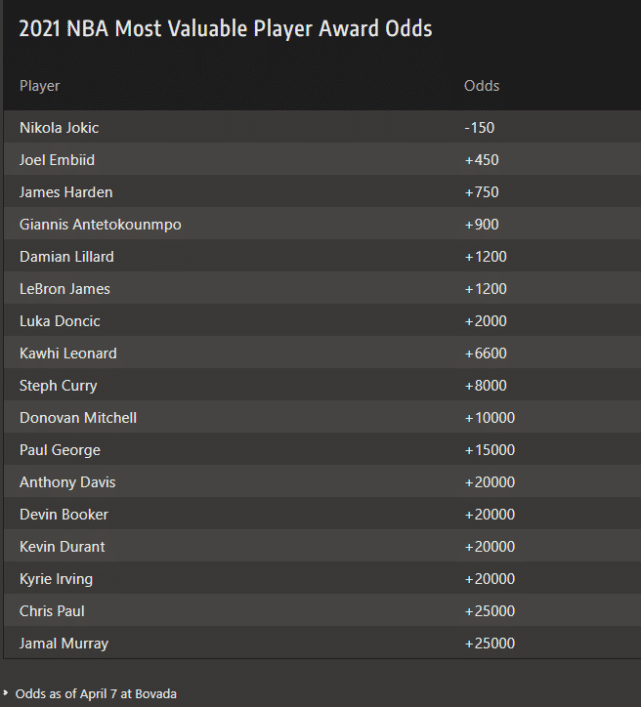 最新MVP赔率出炉!杜兰特复出仅第12位,约基奇强势领跑哈登第三