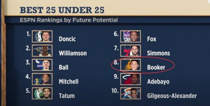 那么为什么这家权威媒体会将布克的排名排到第八位呢?甚至连福克斯和三球都比不过,难道是由于他们看中了福克斯和三球的潜力吗?三球还只是新秀赛季,他的潜力有多少还没有完全兑现,这个姑且不谈。然而福克斯却有很大的争议,因为福克斯本身和布克的年龄相差不远,而且福克斯在独自带队的情况下也没有将球队带入季后赛,数据又比不上布克,凭什么福克斯可以比布克排名高。