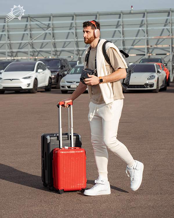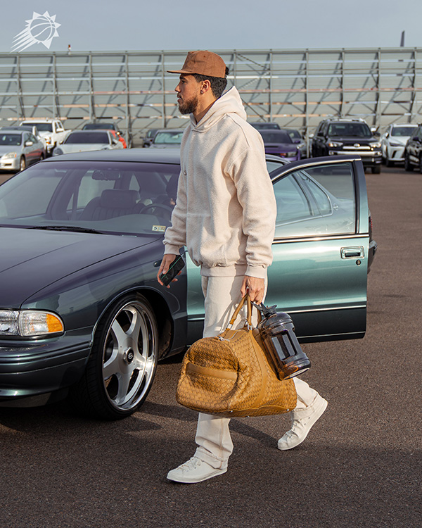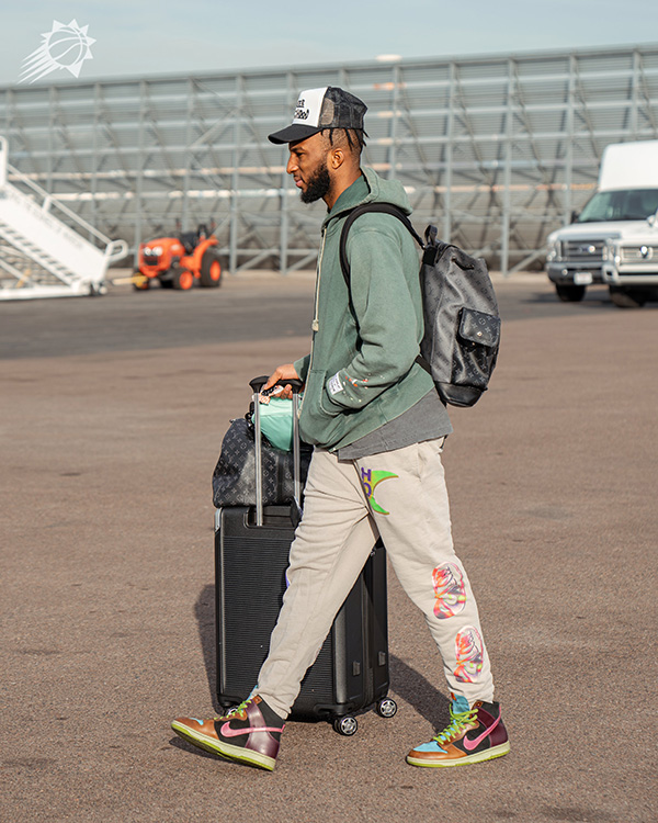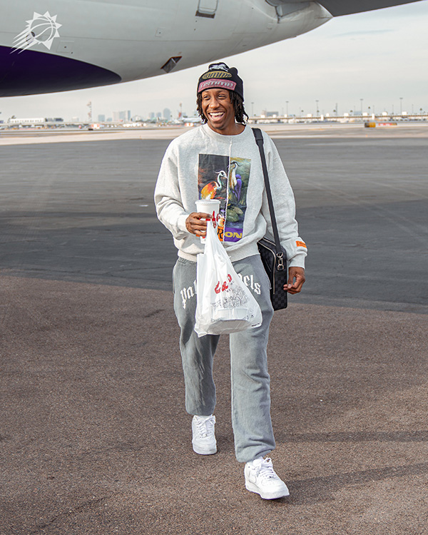 布克身穿白色长裤和连帽卫衣,戴着棒球帽、提着名包和吨吨桶登机;上一场布克复出轰下34分10篮板7助攻帮助球队再次击败灰熊。