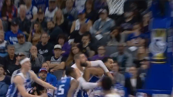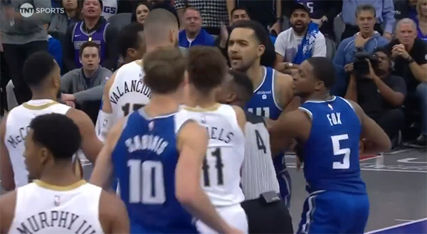 第二节5分30秒,瓦兰丘纳斯和莱尔斯两人纠缠在一起,两人在篮下卡位时瓦兰有一个手臂推人的动作,之后在转换进攻中瓦兰肘击到莱尔斯,后者十分生气,直接挥拳击打瓦兰的后脑勺,随后两人撞胸激烈互喷,福克斯、巴恩斯等人赶紧过来劝架,裁判和鹈鹕主帅都冲过来。