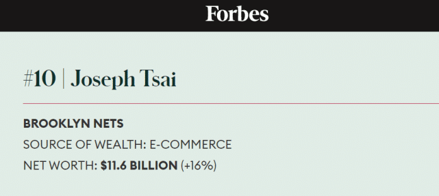 拥有篮网队的老板蔡崇信,净资产是116亿美元,年增长16%。福布斯列出他的财富主要来源是电商,篮网目前是人气最高的NBA球队之一,原本就拥有杜兰特和欧文的他们,通过交易和签约等操作又引进了哈登、格里芬和阿尔德里奇,已经成为冲击总冠军的最大热门。