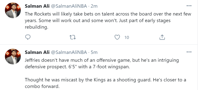 Ali也点评了火箭的运作。他在社媒上写道:“火箭接下来的几年里会把注意力都放在押注天赋上,有些运作会奏效,有些则不会,这只是他们早期重建的一部分。”换言之,休城也已经全面进入刮奖时代,火箭会通过选秀、签约、认领等方式收集他们看好的年轻球员,中奖的彩票可能寥寥无几,但火箭也是低风险运作,只要刮出一张,就算是赚到了。小波特就是火箭本赛季的一大收获。