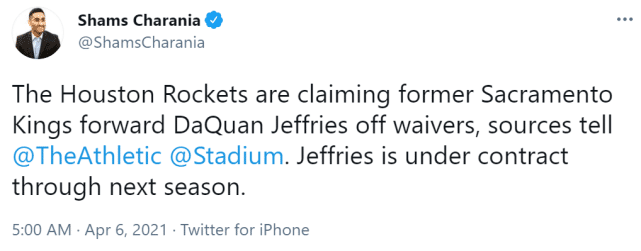 火箭近日接连运作,他们之前裁掉了麦克勒莫和双向球员帕顿,和后卫阿莫尼-布鲁克斯签了一份新的双向合同,如今又认领杰弗里斯,他顶替的就是麦克勒莫的阵容位置。现在的火箭,阵容逐渐年轻化,继续向着重建的目标前进。杰弗里斯的合同还剩两年,本赛季薪水144万美元,下赛季薪水170万美元(球队选项)。