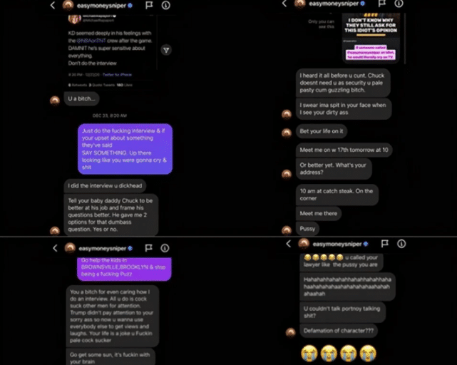 来源:JRS直播网04-06 11:25JRS直播网讯 前段时间杜兰特最大的新闻就是被联盟罚款5万美元,这件事情的起因是演员迈克尔-拉帕波特(Michael Rapoport)在社交媒体上公开了他和杜兰特之间的聊天记录,其中很明显杜兰特有很多不当的言论,使用侮辱性的词语,其中就包括歧视等等。虽然杜兰特很快就进行了道歉,但据悉迈克尔-拉帕波特没有接受杜兰特的歉意,而且还找到了律师,希望进行维权。后期这件事情以NBA联盟罚款杜兰特5万美元而结束,但对于迈克尔-拉帕波特来说,这件事情并没有这么简单。