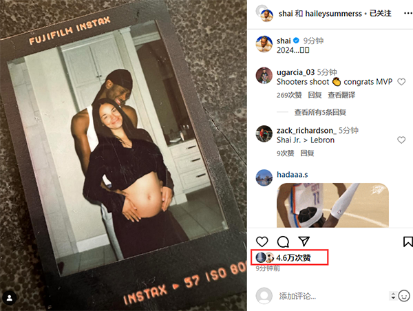雷霆球星亚历山大在社交媒体上宣布喜讯,晒出他搂着女友海莉的亲密合影,海莉挺着肚子,他们两人都满脸笑容十分甜蜜,亚历山大配文写道:2024....(这是海莉的预产期)。