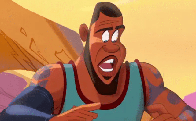 除了詹姆斯自己,利拉德、克莱-汤普森、浓眉、WNBA明星陶乐西也都在预告片中出现。詹姆斯的卡通形象(下图),还蛮有特色,他在进入卡通世界后的变身场景也很有趣,掉进沙漠溅起的沙子都是篮筐的造型。