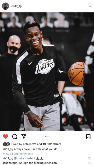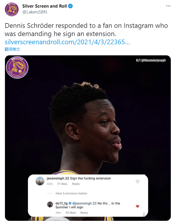 来源:JRS直播网04-04 14:01JRS直播网讯湖人主力球员施罗德明确表示拒绝提前续约,不久前,施罗德更新社交媒体,晒出身穿湖人训练服的照片,满脸笑容十分开心,并且写道:总是对你的工作充满乐趣。