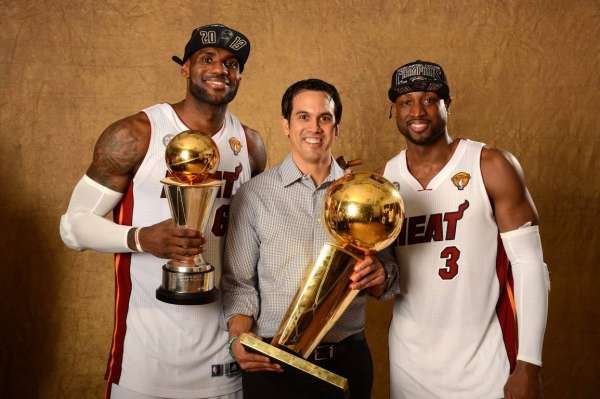2010年,詹姆斯转会至迈阿密热火队。2012年,詹姆斯得到NBA个人生涯的第3座常规赛MVP,第1个总冠军和总决赛MVP,并代表美国男篮获得了伦敦奥运会金牌,追平了迈克尔·乔丹在1992年所创的纪录。2013年,詹姆斯获得第4个常规赛MVP、第2个NBA总冠军和第2个总决赛MVP,实现两连冠。