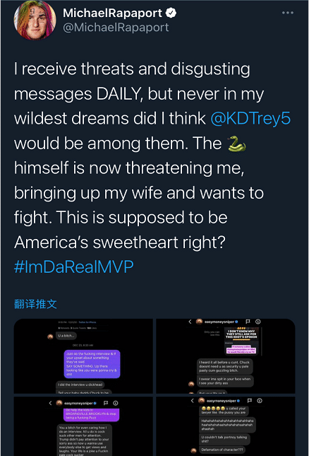 近期,双方在社交媒体私聊进行了互喷,可是让杜兰特没有想到的是他被钓鱼了。在私聊中,情绪激动的杜兰特使用了B***CH词汇,他攻击范围涉及到了拉帕波特的妻子,网络上喷完的杜兰特还不尽兴地邀请拉帕波特场下单挑约架,可是让杜兰特没有想到的是,拉帕波特把两个人的私聊记录放到了网络上,这下杜兰特可能后悔没有用小号了,因为他成为了众矢之的,在压力之下,杜兰特选择了道歉,可惜的是拉帕波特并不接受,很快杜兰特因为这些原因也被联盟罚款5万美元。