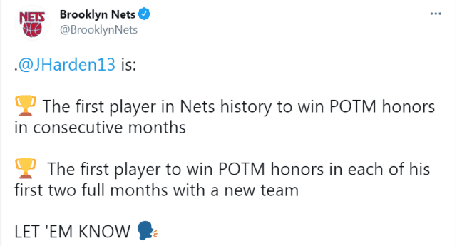 哈登是篮网队史上第4位获得月最佳荣誉的球员,他加盟篮网后已经两获殊荣,其余三位是卡特(3次)、基德(2次)、马丁(1次)。