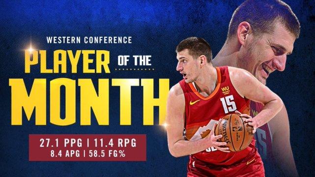 约基奇当选3月份西部最佳球员,这是约基奇职业生涯第二次获此殊荣,也是本赛季第二次。他成为掘金队史上第一位在同一个赛季两次当选月最佳的球员。而在掘金生涯至少两次当选月最佳的球员,除了约基奇,还有安东尼和英格利什。