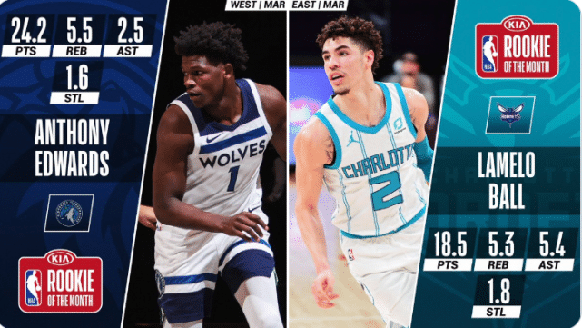 爱德华兹3月份场均出场35分钟,得到24.2分5.5篮板2.5助攻1.6抢断。鲍尔3月份场均出场27.5分钟,得到18.5分5.3篮板5.4助攻1.8抢断。黄蜂晒出了波尔的成就:他是过去60年唯一一位在全明星周末前总得分、总助攻、总篮板和总抢断都排在新秀首位的球员。目前波尔还在养伤,本赛季能否复出尚未确定。