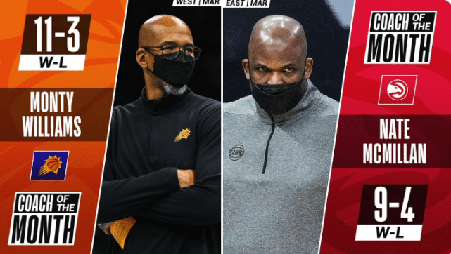 麦克米兰率领老鹰在3月份取得9胜4负的成绩,目前以23胜24负排名东部第7;威廉姆斯率领太阳在3月份取得了11胜3负的成绩,目前以33胜14负排名西部第2。