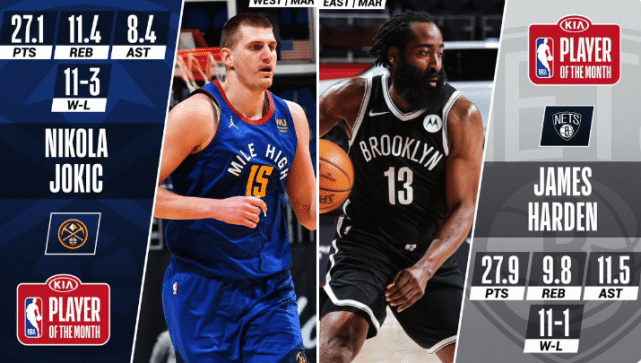 官宣3月最佳奖项!哈登创三大纪录当选,约基奇成掘金队史第一人