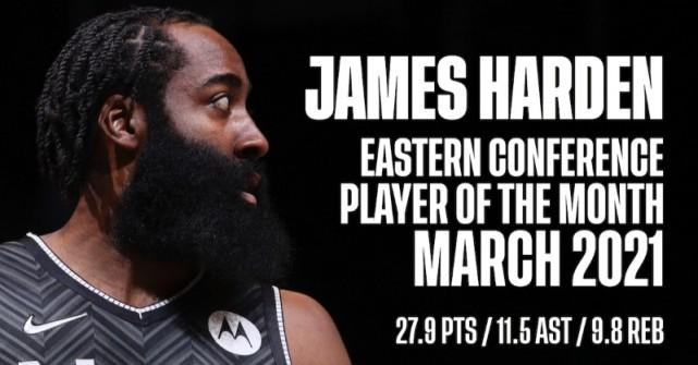 3月份,哈登率领篮网取得11胜2负的NBA最佳战绩,其中他登场的12场比赛,篮网11胜1负。哈登在这个月场均27.9分9.8篮板11.5助攻1.6抢断,篮网的11胜2负也追平了球队历史单月的最佳战绩,他们曾经在2004年2月也打出过11胜2负。篮网击败火箭后登顶东部,这也是他们自2003年4月13日以后首次排名东部第一。