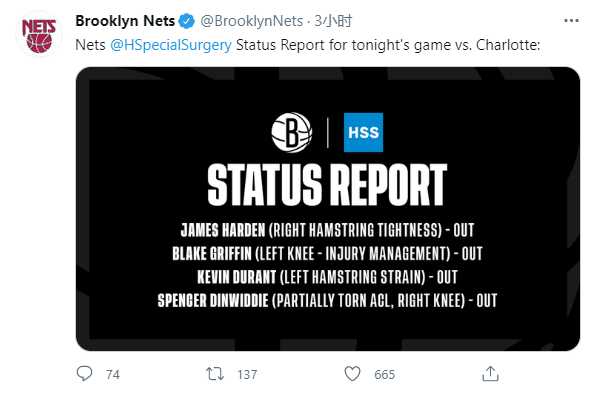 篮网对阵黄蜂赛前,纳什谈到哈登的伤情:目前哈登感觉良好,他已经进行了磁共振扫描,结果很清晰,伤势并无大碍,预计他在接下来的几场比赛中能够复出。