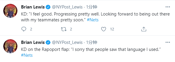 刚不久,杜兰特亲自回应伤势,直言:我感觉很好,伤愈进展不错,期待很快就能和队友们在一起;杜兰特也回应此前的不当言论,正式公开道歉:对不起,大家看到了我使用那样的语言,这不是我想让大家看到的。