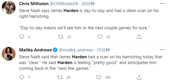 来源:JRS直播网04-02 11:57JRS直播网讯 哈登最新检查结果曝光,篮网主教练纳什透露哈登腿筋伤情,相信哈登很快就能重返赛场。