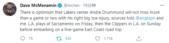 来源:JRS直播网04-02 11:53JRS直播网讯 湖人新援庄神最新伤情出炉,据湖人记者Dave McMenamin报道,湖人内部乐观估计,德拉蒙德最多缺席1-2场,上一场对阵雄鹿,庄神首秀仅打14分钟便因伤退赛,伤情确诊为脚趾挫伤,受伤离场前6投2中拿到4分2助攻1盖帽1篮板。