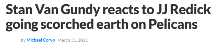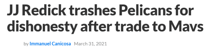 来源:JRS直播网04-01 17:12JRS直播网讯北京时间4月1日,雷迪克在一档播客节目上炮轰老东家鹈鹕言而无信,他表示自己在交易截止日获悉被交易到独行侠后非常生气。鹈鹕主帅大范甘迪第一时间回应昔日弟子的言论。