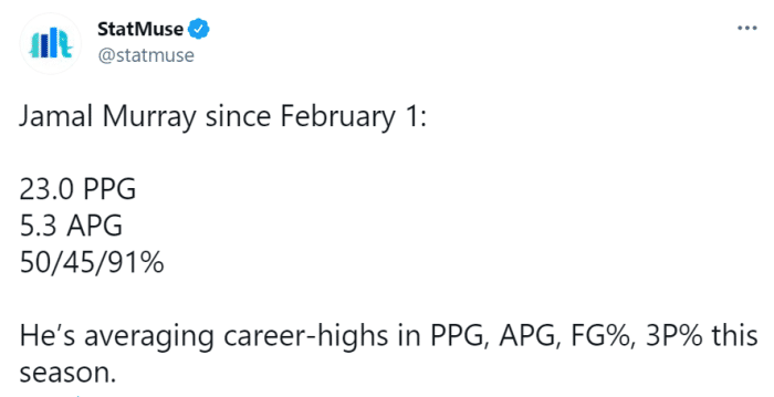 据statmuse统计,自从2月1日以来,贾马尔穆雷场均可以砍下23分5.3助攻,且命中率高达50%,三分命中率45%,罚球命中率91%。赛季至今,他的场均得分、助攻、命中率和三分命中率都创了个人生涯新高!