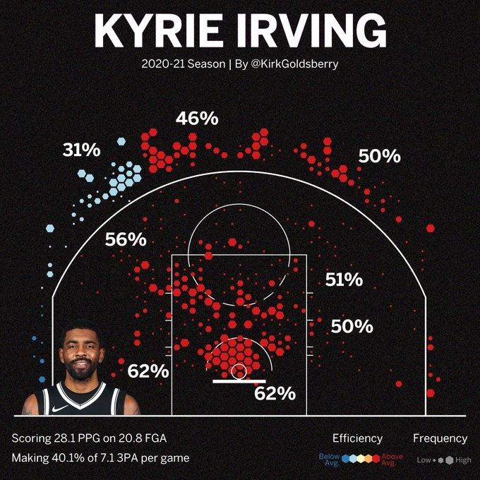 而欧文也拿到了生涯最佳数据,场均28.1分,三项命中率50/40/90,效率出奇的高!知名数据专家Kirk Goldsberry晒出一张欧文本赛季的投篮热图本赛季欧文在篮下,中距离,弧顶、左侧45度及左侧底角的命中率均明显高于联盟平均水平,几乎投篮无死角!