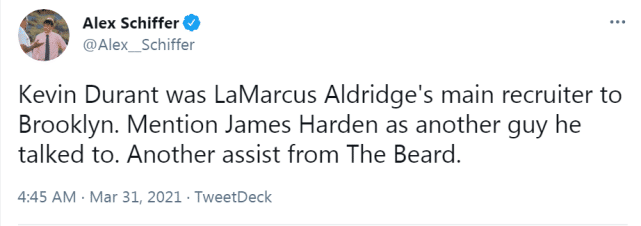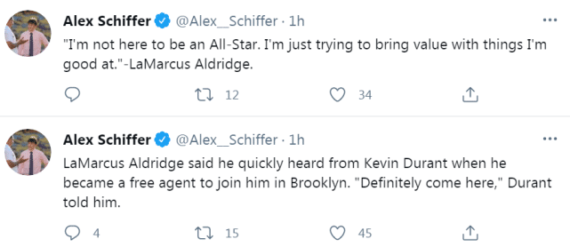 来源:JRS直播网03-31 15:08JRS直播网讯北京时间3月31日,篮网新援阿尔德里奇在加盟后首次接受采访,据他透露,杜兰特和哈登是招募自己的篮网球星,其中,杜兰特招募最积极,而哈登也找他交流过。篮网记者Alex Schiffer调侃道:“这是大胡子送出的又一记助攻。”