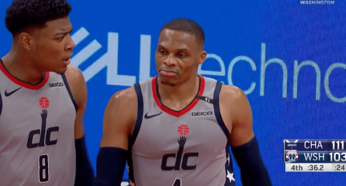 末节奇才长时间被黄蜂压制,韦少三次投篮不中,还出现2次失误,落后两位数之后,奇才打出8-0小高潮,韦少助攻八村塁反击暴扣,韦少追身打板中投追到仅落后3分,随后黄蜂4-0稳住局面,八村塁抛投延续悬念,罗齐尔三分一剑封喉,分差又来到10分。