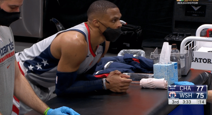 首节比赛,韦少连续命中两记三分球,可惜几次中投都没有命中,到了第二节,韦少在节末再次命中三分,半场结束前助攻八村塁投进压哨三分球;韦少半场9投3中轰下11分8助攻5篮板,这数据又奔着三双去了。