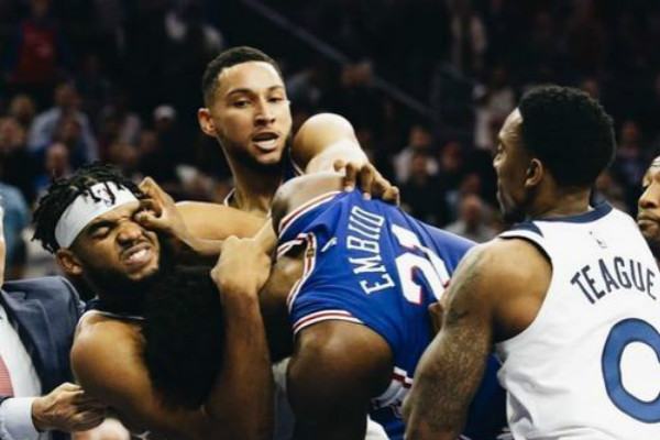 在本赛季初,费城76人对阵明尼苏达森林狼的一场比赛中,唐斯和恩比德爆发了激烈的冲突,最后竟然拳脚相向,两人扭动在了一起,好在76人队的本·西蒙斯即使将唐斯压倒在地,制止了冲突的再一次升级。