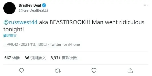 这注定是属于威少的一晚,各路人马都在狂吹,因髋关节受伤未能出战的比尔,在推特激动地写道:“威少又叫做威兽!这个男人今晚猛得离谱!”