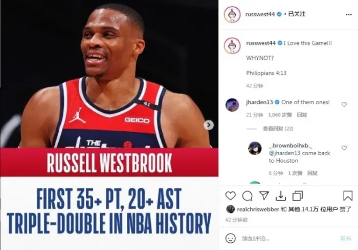 威少对自己的个人数据和比赛结果也是相当满意,晒出了自己的数据纪录(NBA历史上首位砍下35分20助三双的球员),并写道:“我爱这比赛!为什么不呢?”