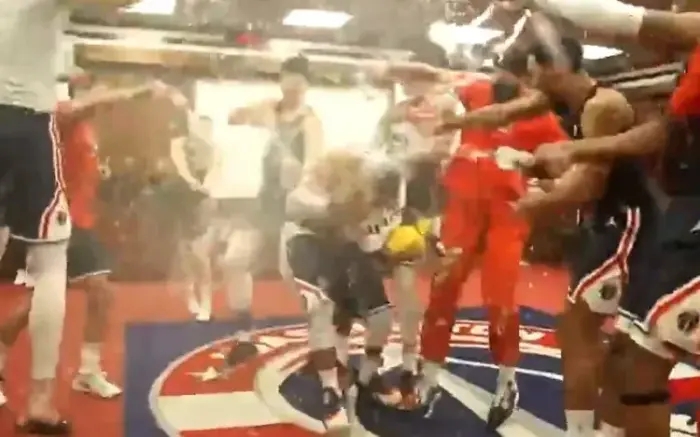 可赛后接受完采访,威少回到更衣室时竟然被主帅布克鲁斯残忍推向众多大汉包围圈,尽情享受着被泼水庆祝的待遇,那场面十分蕉灼。