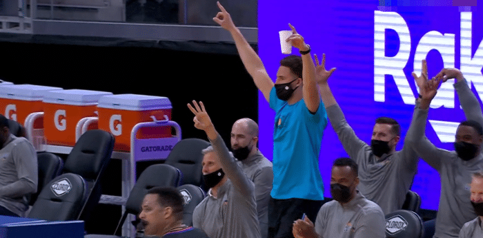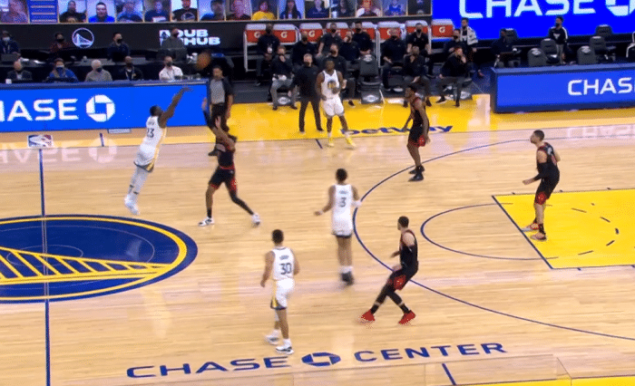 第三节维金斯库里追梦三分都不进,库里单打武切维奇抛投打成2+1然后再进三分,拉文突破造犯规,帕威命中中投,库里急停中投然后再突破造犯规!暂停回来库里再进三分低手上篮也有,追梦格林三分也有,马尔卡宁三分也有,贝兹莫尔翻身跳投,三节战罢勇士领先11分,库里单节14分!