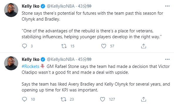 火箭总经理斯通还谈到交易奥拉迪波,他表示奥拉迪波不适合火箭,最终球队找到了解决方案;他还表示火箭已经喜欢布拉德利和奥利尼克好几年了,火箭重建为老将提供一个地方,他们的影响力可以帮助年轻球员。