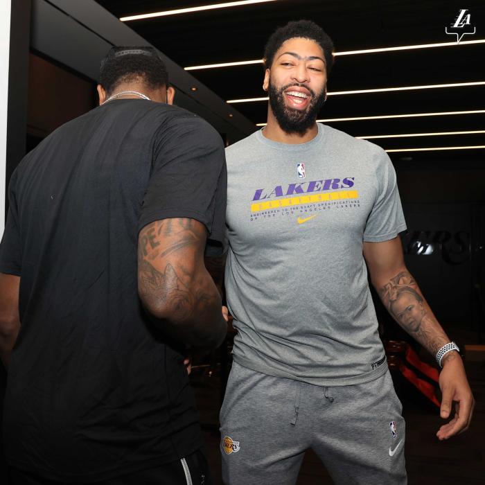 来到斯台普斯球馆时,庄神冲着镜头双手比V,随后他和浓眉撞肩并拥抱,此时浓眉满脸笑容笑开花;浓眉也穿着训练服,继续为复出找状态。