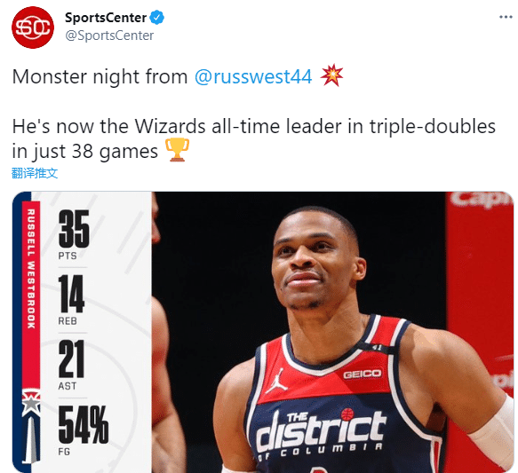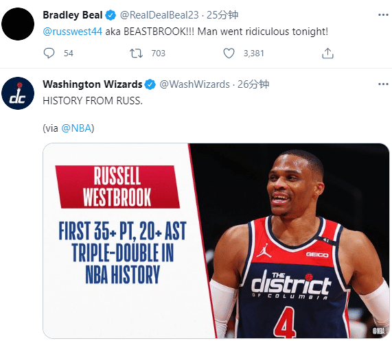 韦少轰下35+20+10超级三双,成为NBA历史上第一位拿到如此恐怖数据的球员,仅打38场便轰下奇才生涯第16次三双,成为奇才队史第一人,比肩魔术师和大O成历史第三位轰下30+20+10的球员,;随后韦少冲上热搜引热议,美媒纷纷盛赞韦少是野兽,奇才官方嘲讽质疑声:你们都是韦少过气了。
