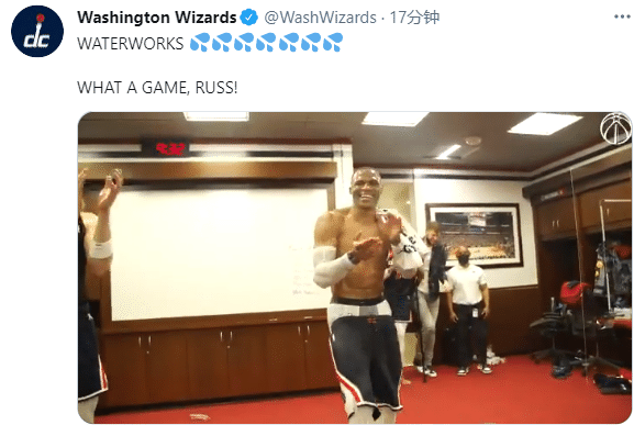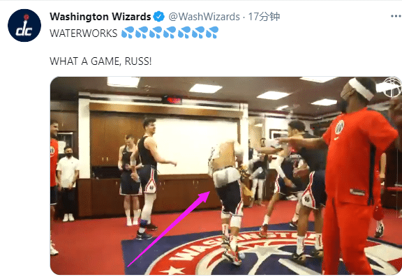 赛后回到更衣室,奇才众队友疯狂泼水庆祝,韦少赤膊露出腹肌,尽享队友泼洒的胜利之水,场面十分欢快,然后韦少咧嘴大笑,和队友一起鼓掌庆祝胜利;有点尴尬的是韦少短裤快掉下来了,露出内裤,尽情庆祝根本顾不上这点小事。