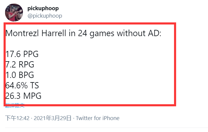 如果把范围扩大一点,赛季至今,安东尼戴维斯已经缺席了24场比赛,哈雷尔在没有浓眉哥这期间场均登场26.3分钟就可以送出17.6分7.2板1帽且真实命中率高达64.6%!换算成每36分钟,接近场均24分10板!这显然是顶级内线级别的发挥!