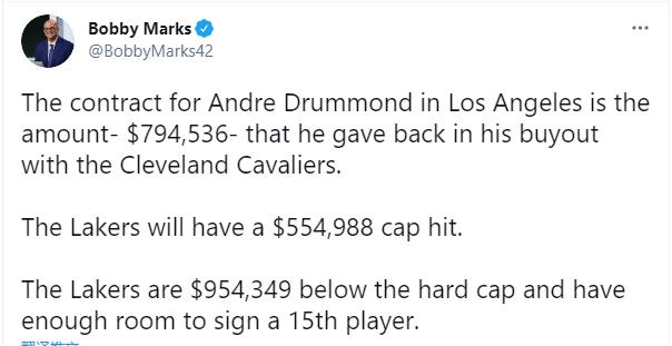 据薪资专家Bobby Marks透露,庄神在和骑士达成买断后共损失了794536美元,这刚好是他和湖人签约后本赛季的工资。由于去年休赛期使用了双年特例签约马修斯,湖人本赛季已经触发了硬工资帽,球队目前距离硬工资帽还差954349美元,仍有足够薪资空间签下第15名球员,他们想再签下一位3D球员!